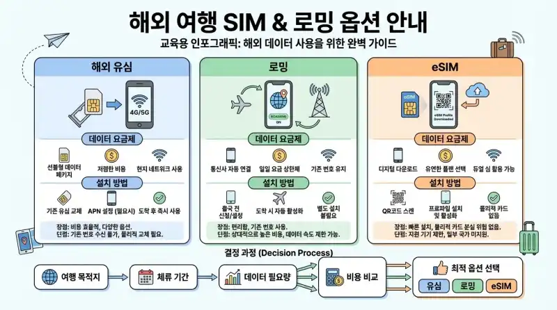 해외 여행 유심카드와 로밍 옵션 설명 다이어그램