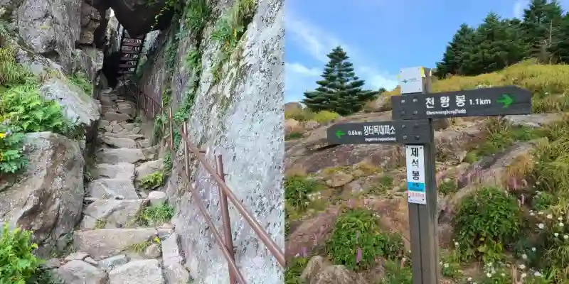 정상에서 오래 머무는 것은 권장되지 않아요. 고도가 높고 바람이 세차기 때문에 체온이 급격히 떨어질 수 있고, 등산객 수가 많을 땐 통행에도 방해가 될 수 있어요. 간단한 사진 촬영 후에는 하산을 시작하거나, 제석봉 방향으로 트래킹을 이어가는 걸 추천해요.
