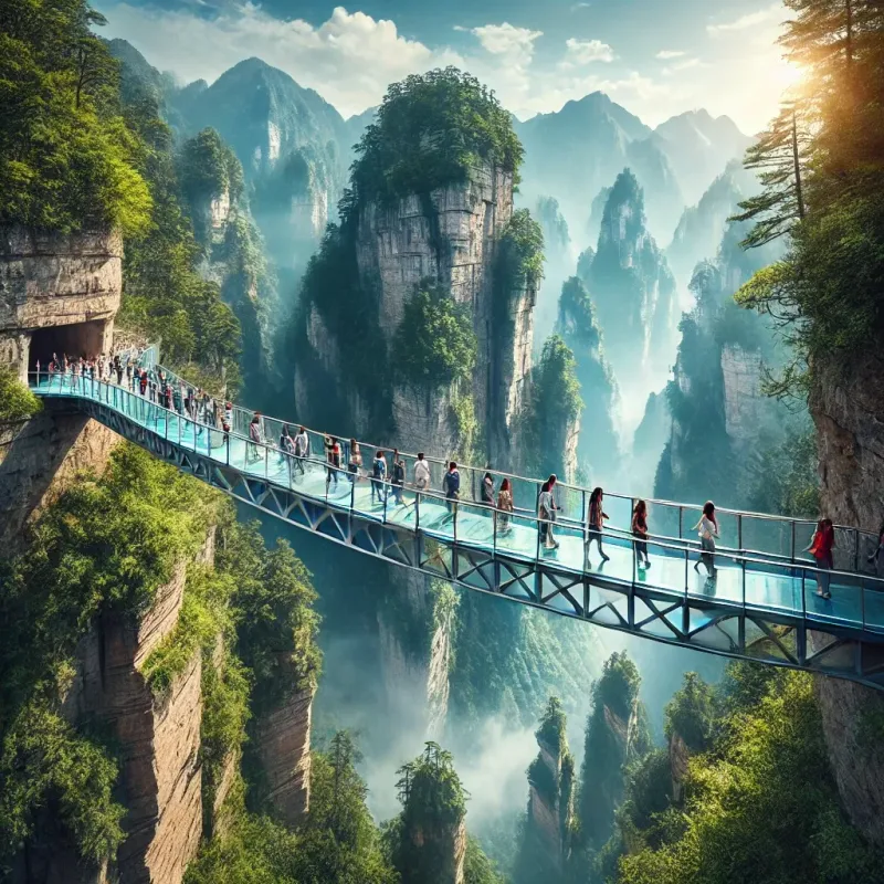 천문산에 위치한 이 유리 다리는 중국의 장자제 국립공원 내에 있습니다. 이 다리는 유리 바닥으로 구성되어 있어, 다리를 건너는 사람들은 아래의 절벽을 그대로 바라볼 수 있습니다. 해발 약 1,400미터에 위치한 이 다리는 그 높이와 투명한 바닥으로 인해 걷는 사람들에게 심리적 공포를 안겨주는데, 두려움을 극복하지 못하는 사람들은 다리의 중간에서 멈추기도 합니다.