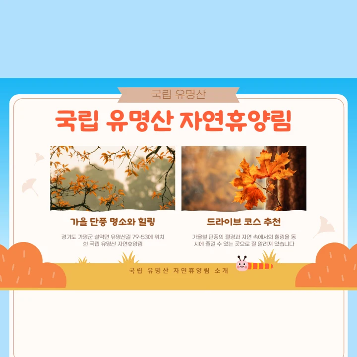 경기도 가평군 설악면 유명산길 79-53에 위치한 국립 유명산 자연휴양림은 가을철 단풍의 절경과 자연 속에서의 힐링을 동시에 즐길 수 있는 곳으로 잘 알려져 있습니다. 이곳은 청평호수를 지나며 가을의 정취를 만끽할 수 있는 드라이브 코스와 함께, 다양한 체험 프로그램과 산림복합체험센터가 마련되어 있어 가족 단위 방문객에게도 인기가 많습니다. 이번 글에서는 유명산 자연휴양림의 매력과 방문 포인트를 소개하며, 가을 나들이를 계획하는 분들을 위한 알찬 정보를 제공합니다.