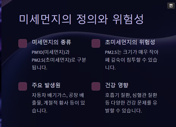 특히, '좋음', '보통', '나쁨', '매우 나쁨'의 4단계로 나뉜 미세먼지 농도 지수를 꼭 확인하세요. 🌬️