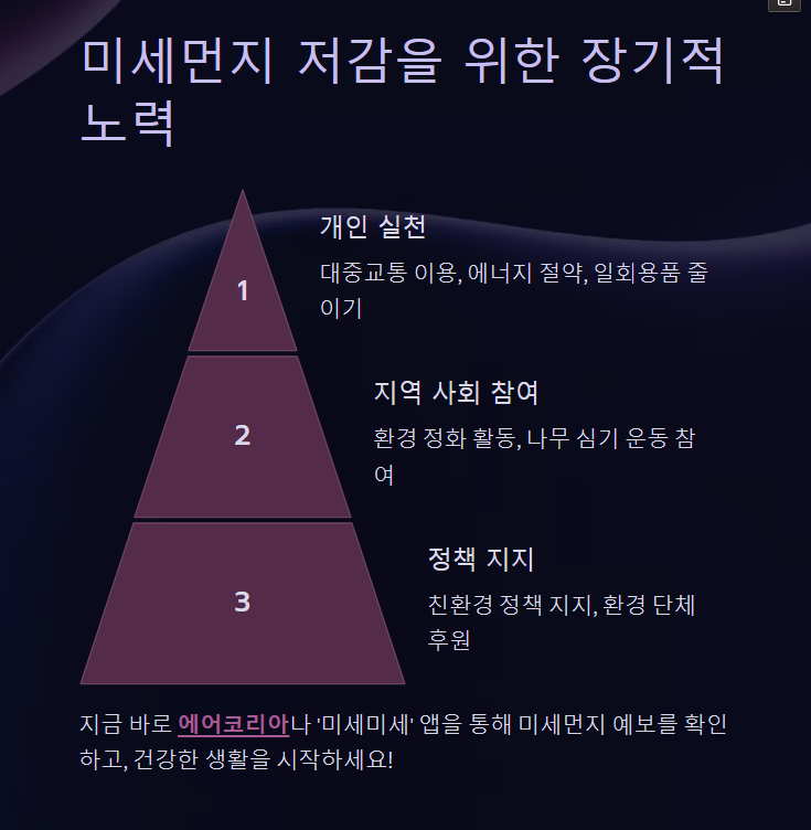 미세먼지는 더 이상 피할 수 없는 현실입니다. 하지만 꾸준히 예보를 확인하고, 적절히 대비하며, 장기적인 환경 개선에 힘쓴다면 미세먼지의 피해를 줄일 수 있어요. 오늘 소개한 방법들을 일상에서 실천하며 건강을 지키세요!