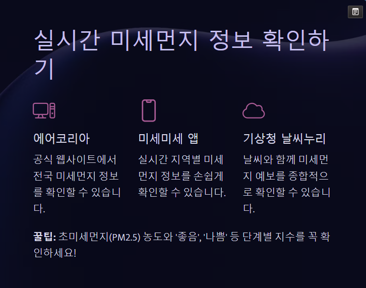 미세먼지 예보는 매일 아침 확인해야 합니다. 아래 사이트와 앱을 활용하면 실시간으로 지역별 정보를 확인할 수 있어요: