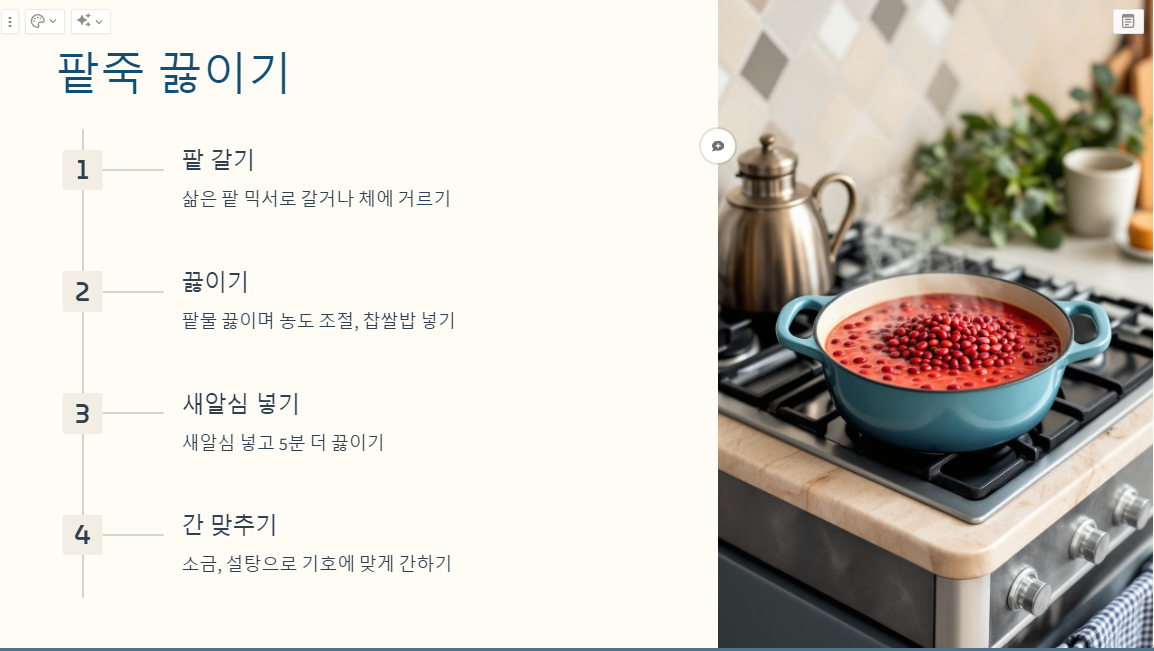 3️⃣ 팥죽 끓이기 – 농도와 간 조절이 중요! 🔥