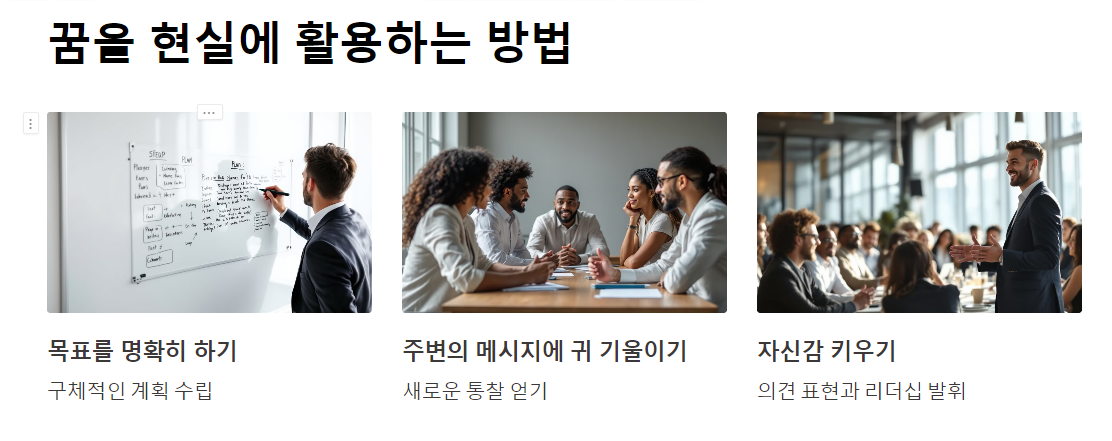 꿈이 당신의 책임감이나 리더십을 강조했다면, 현재 이루고자 하는 목표를 구체화하고 이를 실천하기 위한 계획을 세워보세요. - 주변의 메시지에 귀를 기울이세요