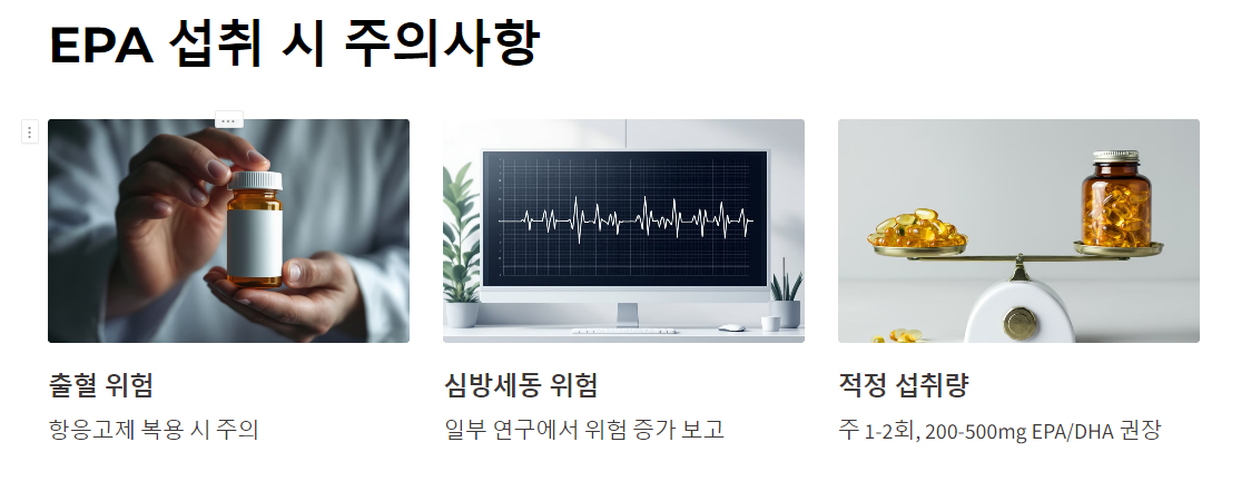 EPA는 혈소판 응집을 억제하여 출혈 위험을 증가시킬 수 있습니다. 따라서 항응고제나 항혈소판제를 복용 중인 환자는 의료진과의 상담을 통해 적절한 섭취량을 조정해야 합니다.