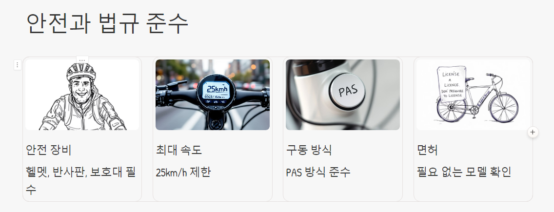 국내 전기자전거는 최대 속도 25km/h 제한과 PAS 방식을 준수해야 일반 도로에서 사용할 수 있습니다. 또한, 면허가 필요 없는 모델인지 확인하세요.