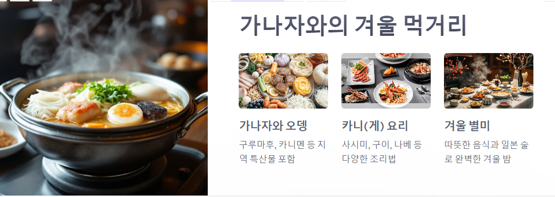 가나자와는 겨울철 신선한 해산물로 유명한데요, 특히 카니(게) 요리는 꼭 맛봐야 할 별미랍니다. 사시미, 구이, 나베 등 다양한 조리법으로 제공되니, 여행 중 꼭 한 번은 드셔보세요!