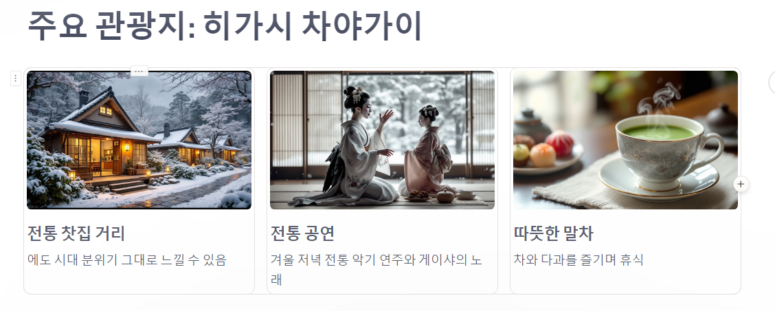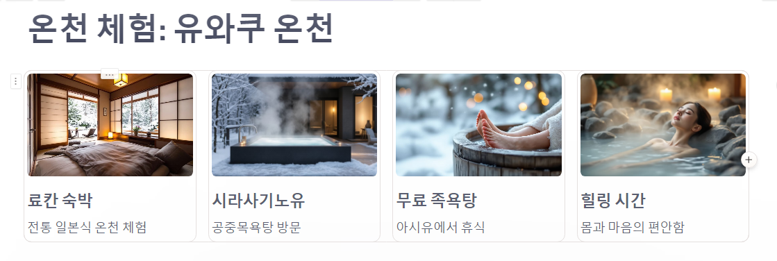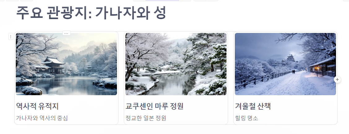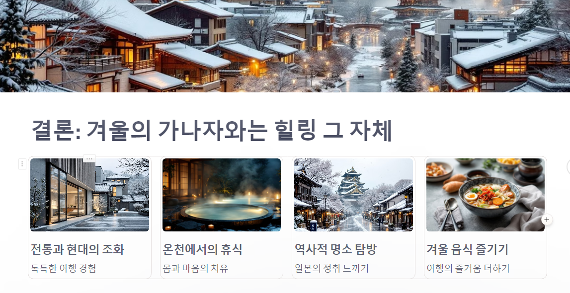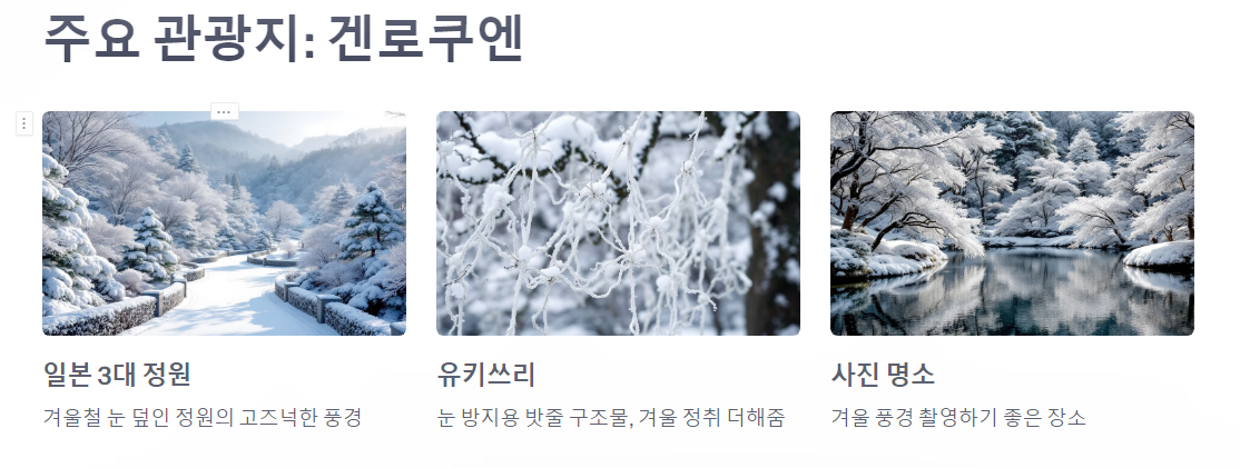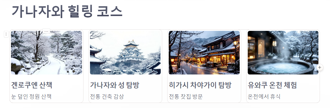 - 눈 덮인 전통 정원과 건축물이 주는 고즈넉한 분위기, 따뜻한 온천과 겨울 먹거리를 경험할 수 있기 때문입니다.