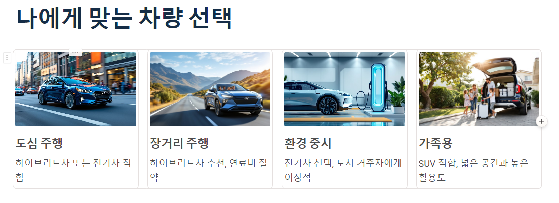 도심에서 단거리 운행이 많다면 하이브리드차나 전기차가 적합합니다. 특히 연비 효율이 높은 하이브리드차는 출퇴근용 차량으로도 이상적입니다.