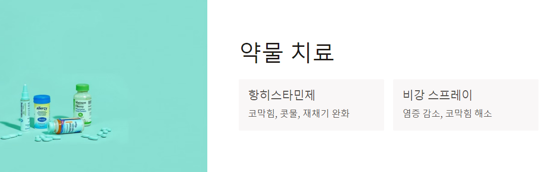 - 비강 스프레이: 스테로이드 비강 스프레이는 염증을 줄이고 코막힘을 해소하는 데 도움이 됩니다.