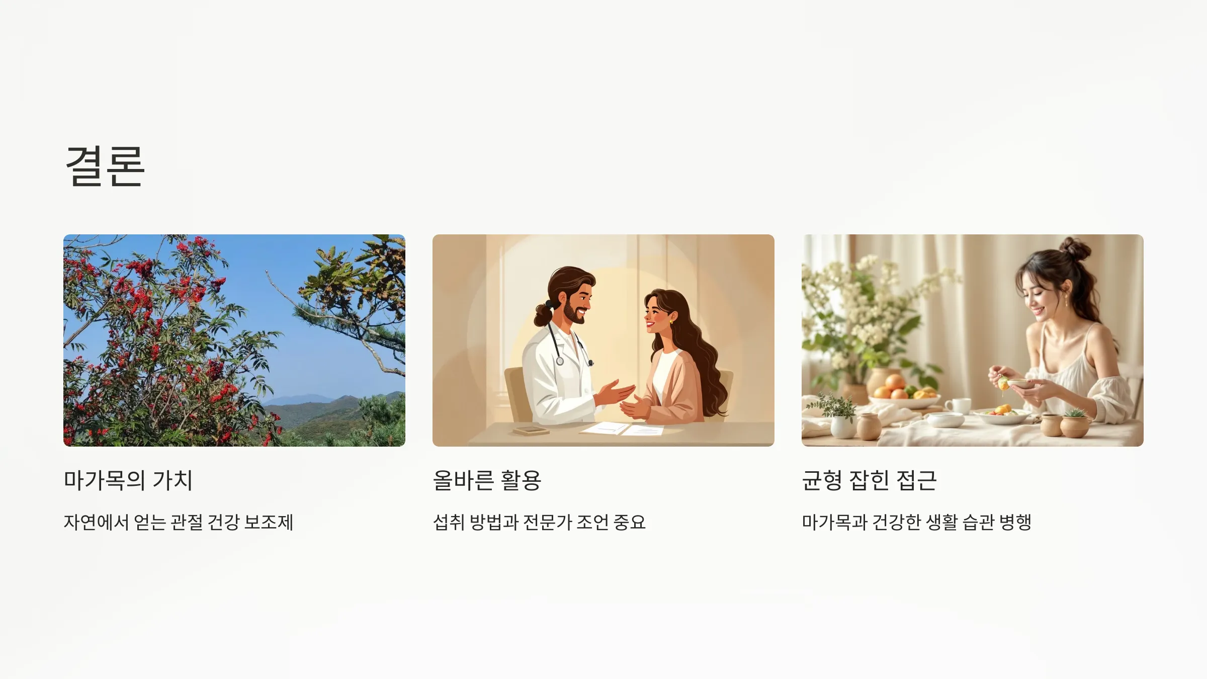 무릎관절 건강은 우리의 일상생활과 직결된 중요한 요소입니다. 마가목은 자연에서 얻을 수 있는 건강 보조제로, 무릎관절 질환 예방과 증상 완화에 도움을 줄 수 있습니다. 하지만 올바른 섭취 방법과 전문가의 조언을 통해 효과적으로 활용해야 합니다. 무릎관절 건강을 위해 마가목과 함께 균형 잡힌 생활 습관을 유지해보세요!