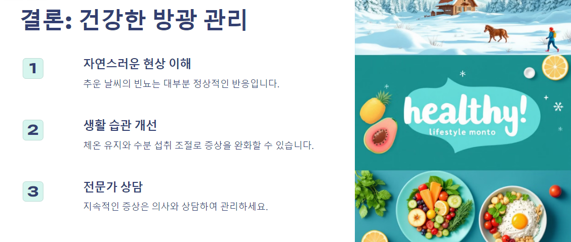 추운 날씨에 소변 빈도가 증가하는 것은 우리 몸이 온도 변화에 적응하는 자연스러운 현상입니다. 그러나 이와 관련된 불편함을 줄이기 위해 체온 유지, 적절한 수분 섭취, 운동 등의 방법을 실천하면 증상이 개선될 수 있습니다. 만약 증상이 지속되거나 다른 건강 문제와 관련되어 있다면, 전문의를 찾아 상담하는 것이 중요합니다.