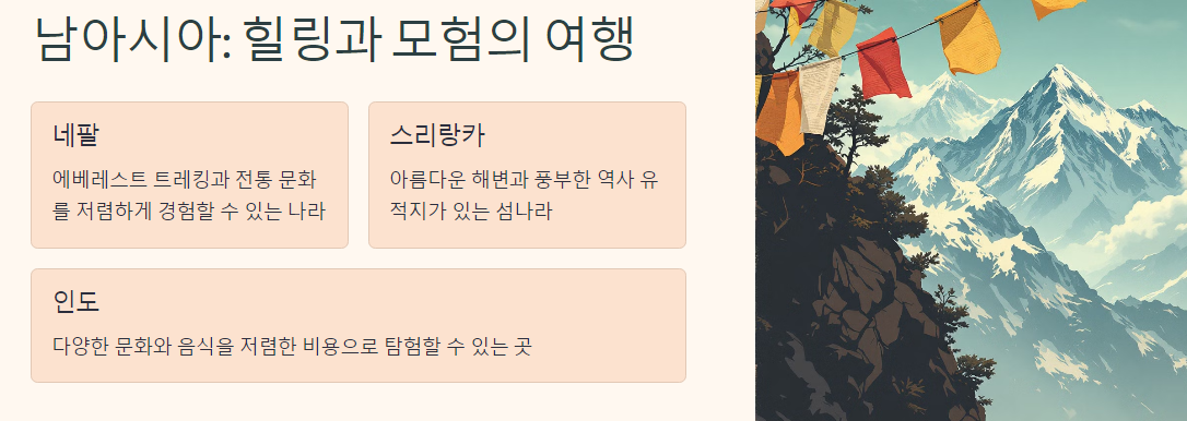 남아시아는 저렴한 여행 경비로 힐링과 모험을 동시에 즐길 수 있는 지역입니다.
