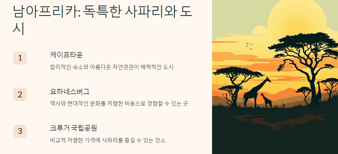 A: 남아프리카의 크루거 국립공원이 가성비 좋은 사파리 여행지로 추천됩니다.
