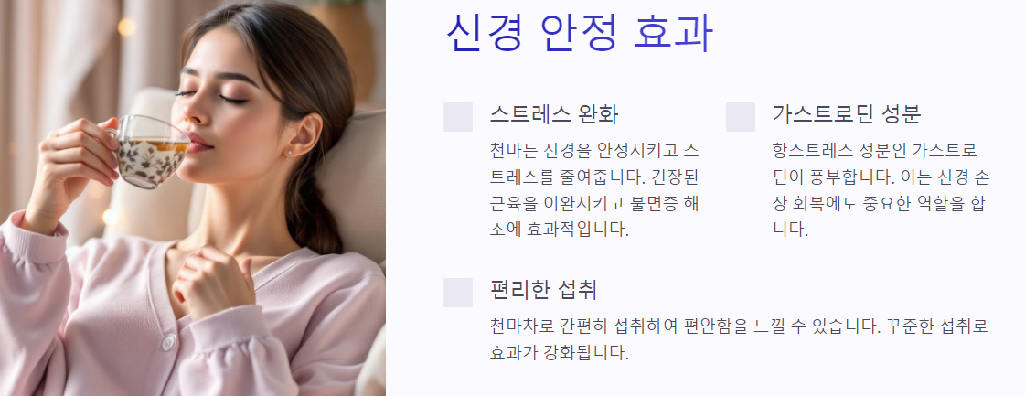천마는 신경을 안정시키고 스트레스 완화에 도움을 줍니다.