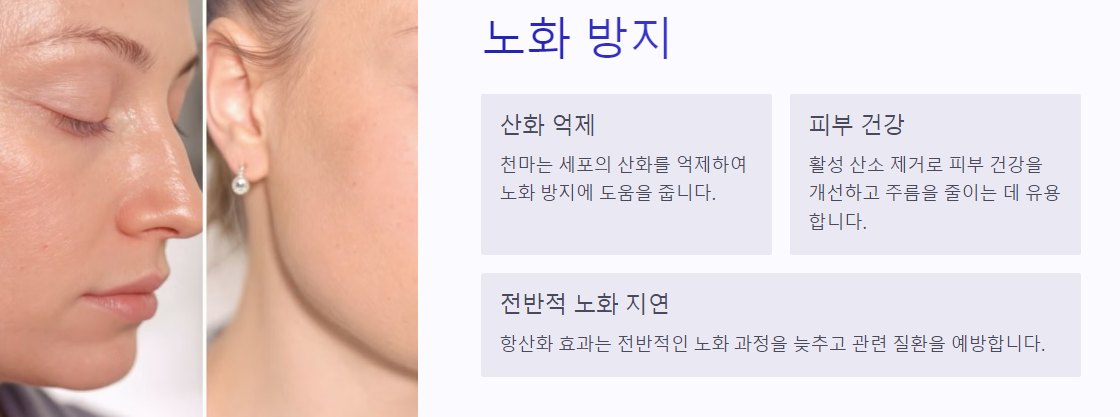 천마는 세포의 산화를 억제하여 노화 방지에 도움을 줍니다.