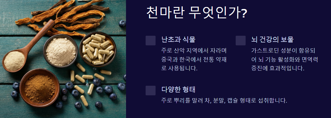 천마는 뇌 기능 활성화와 면역력 증진에 뛰어난 효능을 제공합니다.