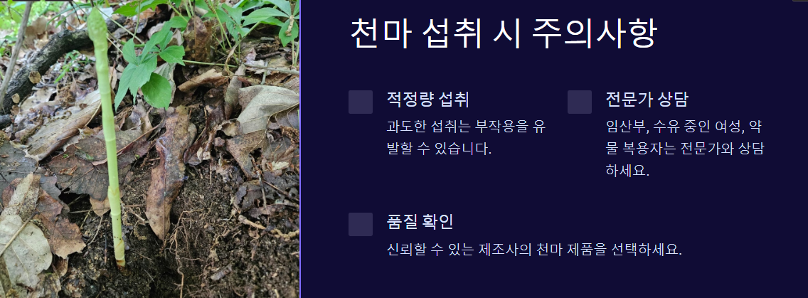 A: 천마는 두통, 치매, 신경계 질환 및 면역력 증진에 효과적입니다.