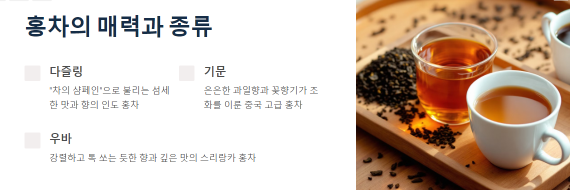 - 잉글리시 블랙퍼스트: 강한 향과 깊은 맛이 특징이며, 아침에 마시면 활력을 불어넣어줍니다.