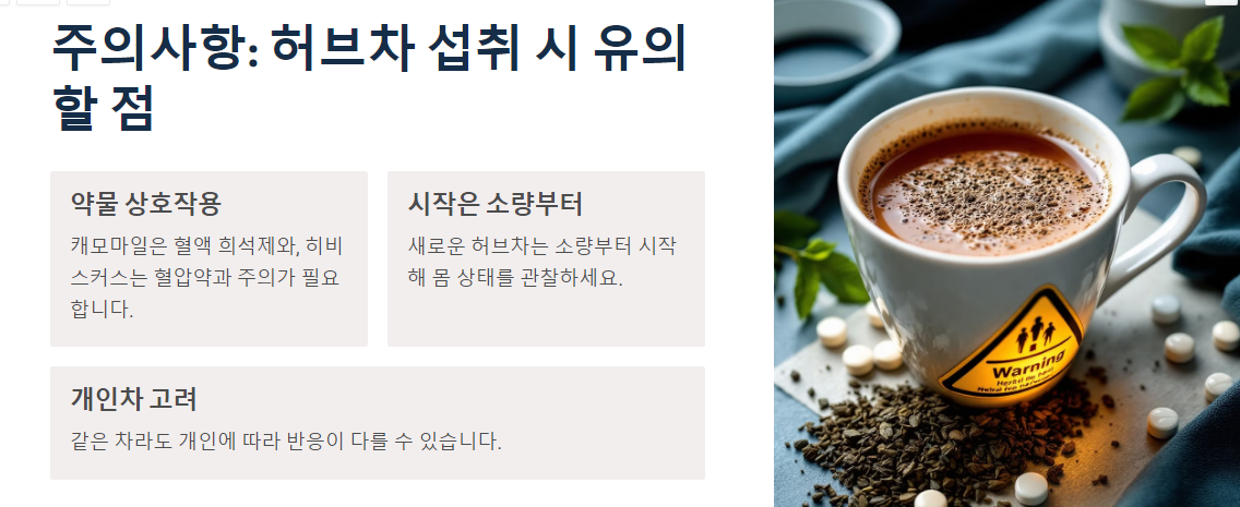 허브차는 천연 성분으로 만들어져 몸에 이롭지만, 특정 약물과 상호작용할 수 있습니다. 예를 들어, 캐모마일은 혈액 희석제와 함께 복용 시 주의가 필요하며, 히비스커스는 혈압약과 함께 섭취 시 부작용이 나타날 수 있습니다. 새로운 허브차를 시도할 때는 소량부터 시작해 자신의 몸 상태를 관찰하는 것이 중요합니다.