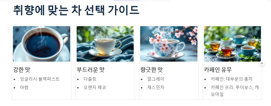 - 오후: 가볍고 향긋한 얼그레이나 다즐링을 추천합니다.