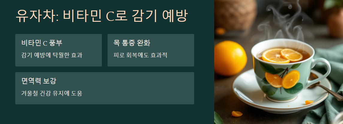 유자차는 비타민 C가 풍부해 감기 예방에 탁월한 효과를 가진 한방차입니다.
