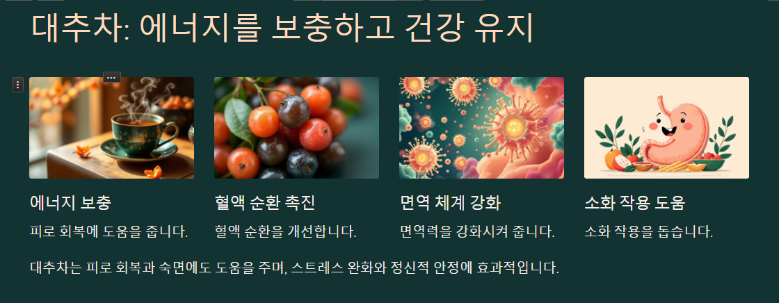 대추차는 에너지 보충과 피로 회복에 효과적인 한방차로 인기가 높습니다.