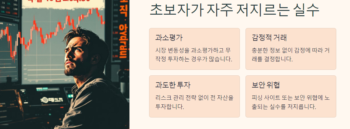 변동성, 보안 위협, 잘못된 투자 판단 등이 주요 위험 요소입니다.