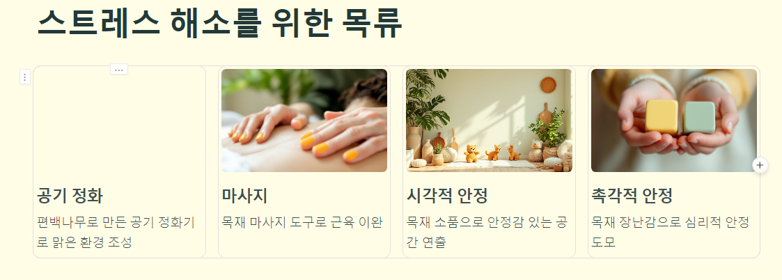 스트레스 완화를 위해 목재 제품을 활용한 힐링 공간을 조성해보세요.