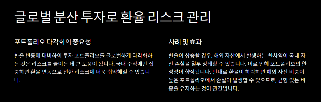 환율 변동에 대비하여 투자 포트폴리오를 글로벌하게 다각화하는 것은 리스크를 줄이는 데 큰 도움이 됩니다. 국내 주식에만 집중하면 환율 변동으로 인한 리스크에 더욱 취약해질 수 있습니다.