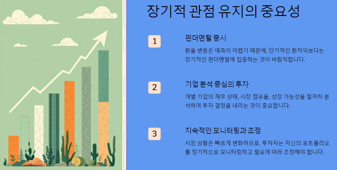 환율 변동은 예측이 어렵기 때문에, 단기적인 환차익보다는 장기적인 펀더멘털에 집중하는 것이 바람직합니다.