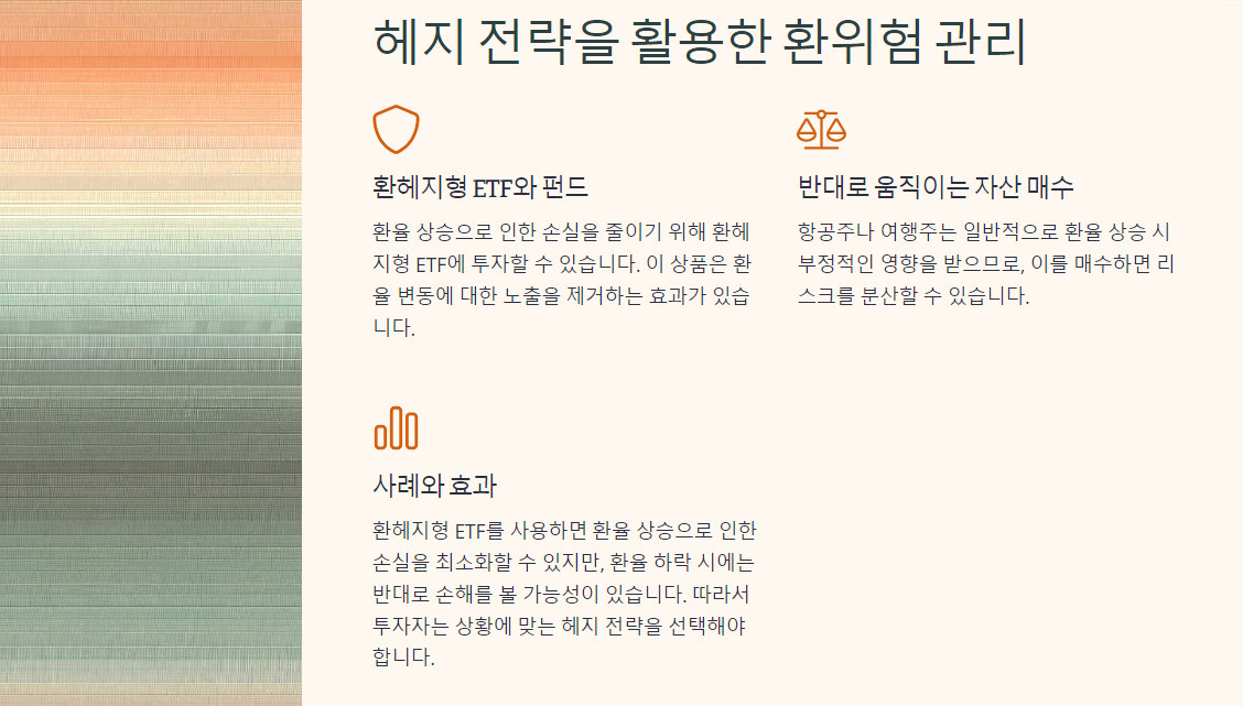 - 환헤지형 ETF와 펀드: 환율 상승으로 인한 손실을 줄이기 위해 환헤지형 ETF에 투자할 수 있습니다. 이 상품은 환율 변동에 대한 노출을 제거하는 효과가 있습니다.