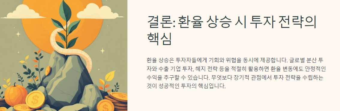 환율 상승은 투자자들에게 기회와 위협을 동시에 제공합니다. 글로벌 분산 투자와 수출 기업 투자, 헤지 전략 등을 적절히 활용하면 환율 변동에도 안정적인 수익을 추구할 수 있습니다. 무엇보다 장기적 관점에서 투자 전략을 수립하는 것이 성공적인 투자의 핵심입니다.