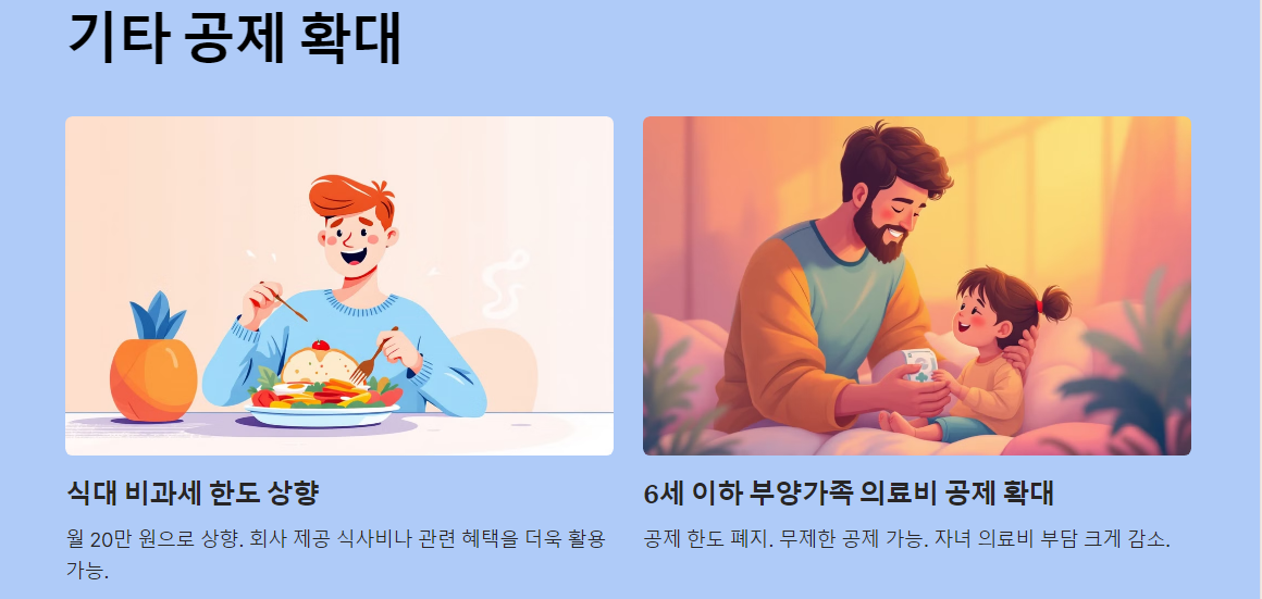 - 식대 비과세 한도가 월 10만 원에서 20만 원으로 상향되었습니다. 이는 회사에서 제공하는 식사비나 관련 혜택을 더욱 활용할 수 있는 기회입니다.