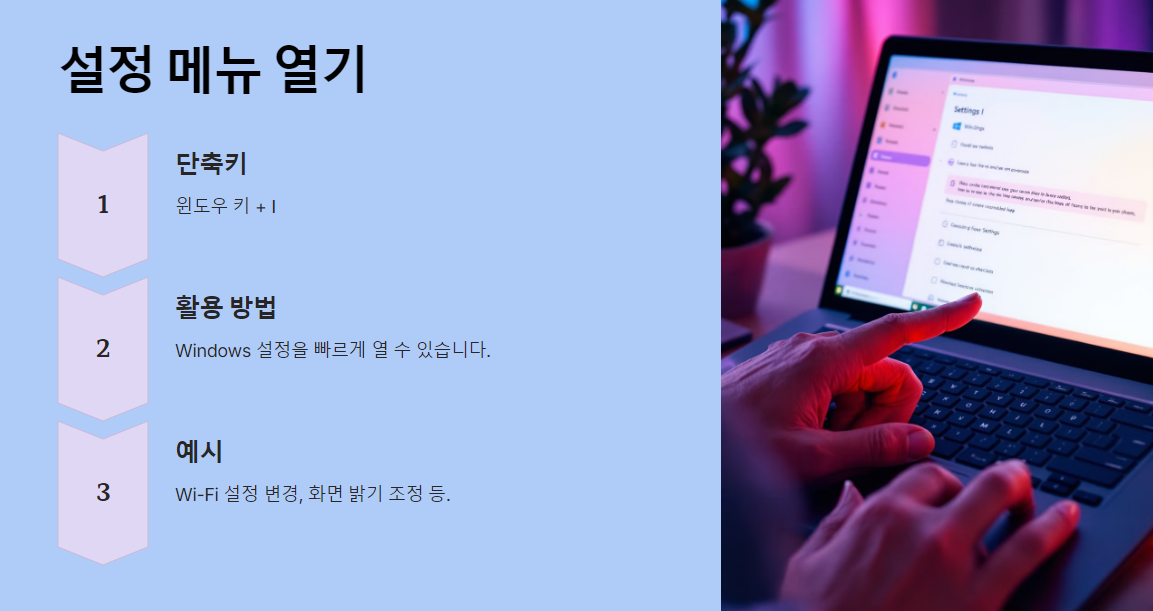 Windows 설정을 빠르게 열려면 "윈도우 키 + I"를 누르세요. 이 단축키는 시스템, 네트워크, 개인화 등의 설정에 쉽게 접근할 수 있습니다.