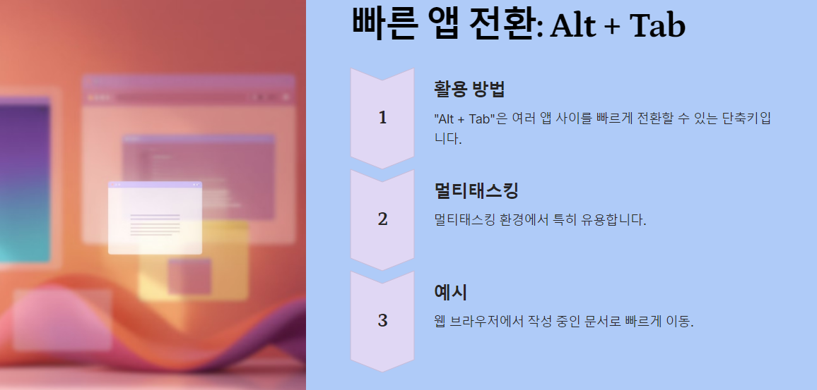 "Alt + Tab"은 여러 앱 사이를 빠르게 전환할 수 있는 단축키입니다. 멀티태스킹 환경에서 특히 유용합니다.
