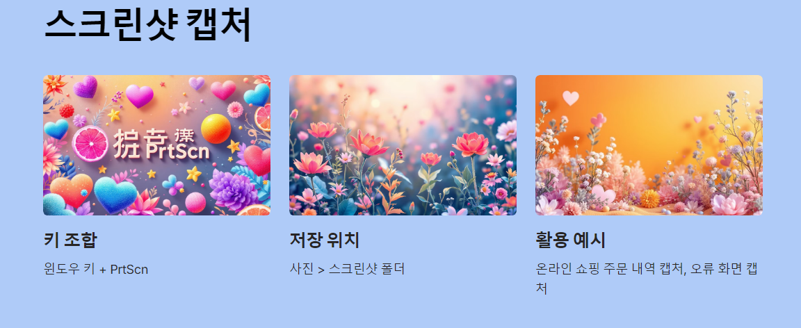 전체 화면의 스크린샷을 캡처하려면 "윈도우 키 + PrtScn"을 누르세요. 캡처된 이미지는 자동으로 "사진 > 스크린샷" 폴더에 저장됩니다.