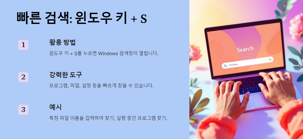 "윈도우 키 + S"를 누르면 Windows 검색창이 열립니다. 이 기능은 프로그램, 파일, 설정 등을 빠르게 찾을 수 있는 강력한 도구입니다.