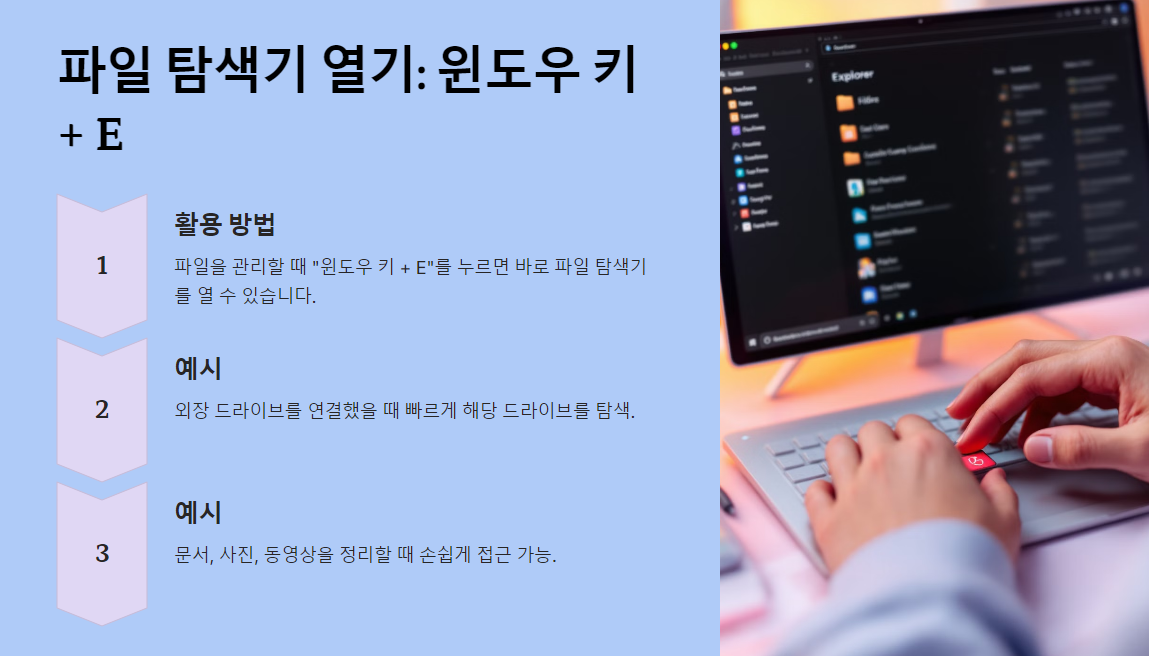 파일을 관리할 때 "윈도우 키 + E"를 누르면 바로 파일 탐색기를 열 수 있습니다. 매번 바탕화면에서 아이콘을 찾거나 메뉴에서 클릭할 필요가 없습니다.