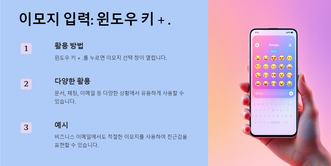 "윈도우 키 + ."를 누르면 이모지 선택 창이 열립니다. 문서, 채팅, 이메일 등 다양한 상황에서 유용하게 사용할 수 있습니다.