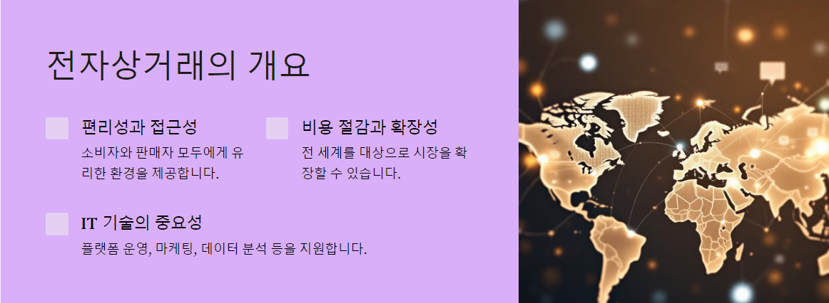 특히, IT 기술의 발전은 전자상거래의 핵심 동력으로 작용하며, 플랫폼 운영, 마케팅, 데이터 분석 등을 지원합니다.