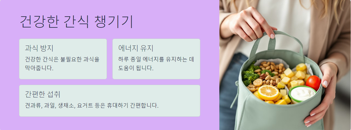 건강한 간식을 챙기면 불필요한 과식을 방지하고 하루 종일 에너지를 유지할 수 있습니다.