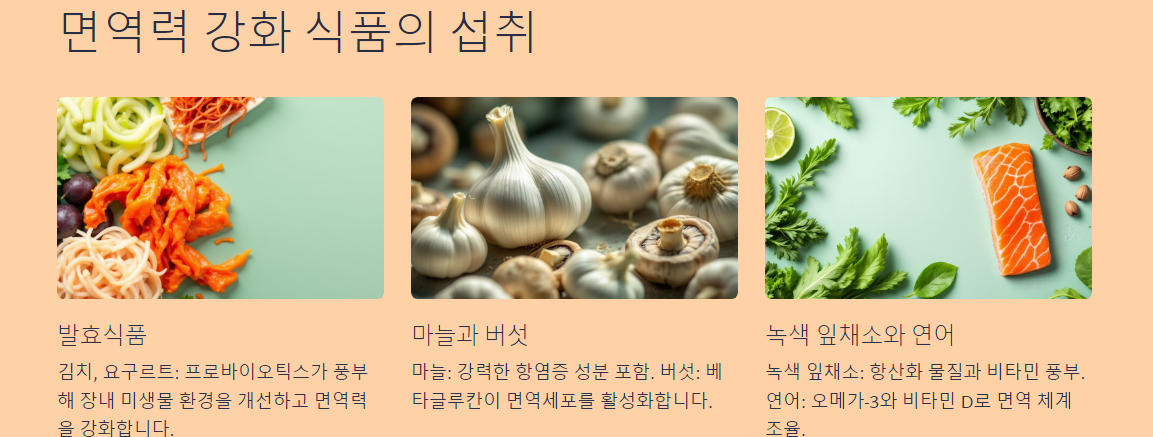 이러한 식품들을 식단에 포함시키면 자연스럽게 면역력을 강화할 수 있습니다.