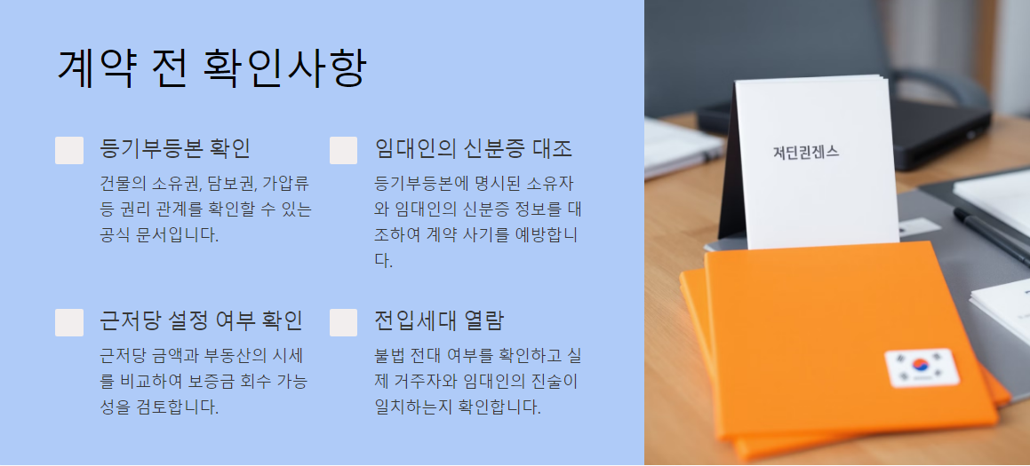 - 담보권 확인: 근저당이나 압류 등 부동산에 설정된 권리가 있는 경우 보증금 회수에 영향을 미칠 수 있습니다.