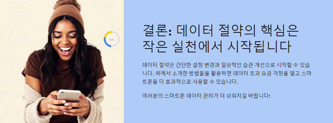 데이터 절약은 간단한 설정 변경과 일상적인 습관 개선으로 시작할 수 있습니다. 위에서 소개한 방법들을 활용하면 데이터 초과 요금 걱정을 덜고 스마트폰을 더 효과적으로 사용할 수 있습니다. 여러분의 스마트폰 데이터 관리가 더 쉬워지길 바랍니다!