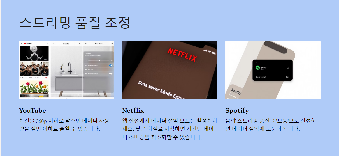 화질을 360p 이하로 낮추면 데이터 사용량을 절반 이하로 줄일 수 있습니다. - Netflix: