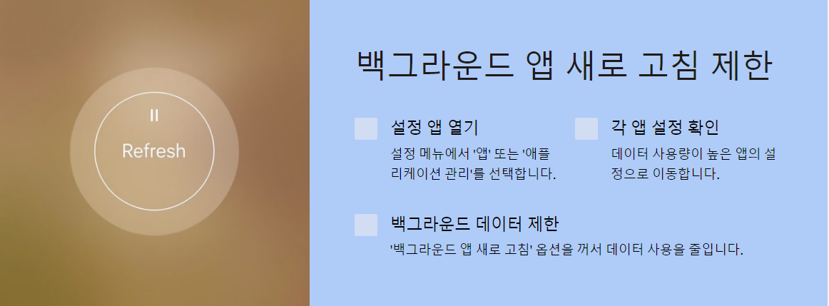 - '백그라운드 앱 새로 고침' 옵션을 꺼서 데이터 사용을 줄입니다.