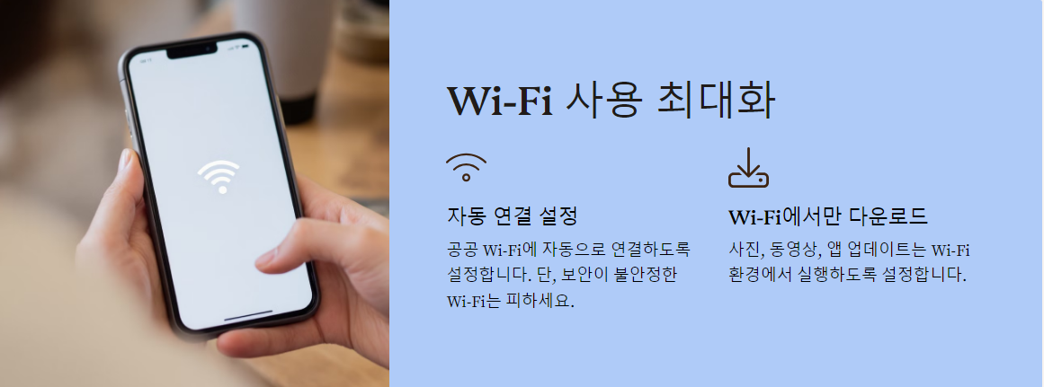 스마트폰 데이터 절약의 기본 원칙은 Wi-Fi 네트워크 최대 활용입니다. Wi-Fi는 대용량 다운로드, 앱 업데이트, 동영상 스트리밍 등에 적합합니다. 공공장소나 가정에서 Wi-Fi에 연결해 데이터를 아끼세요.