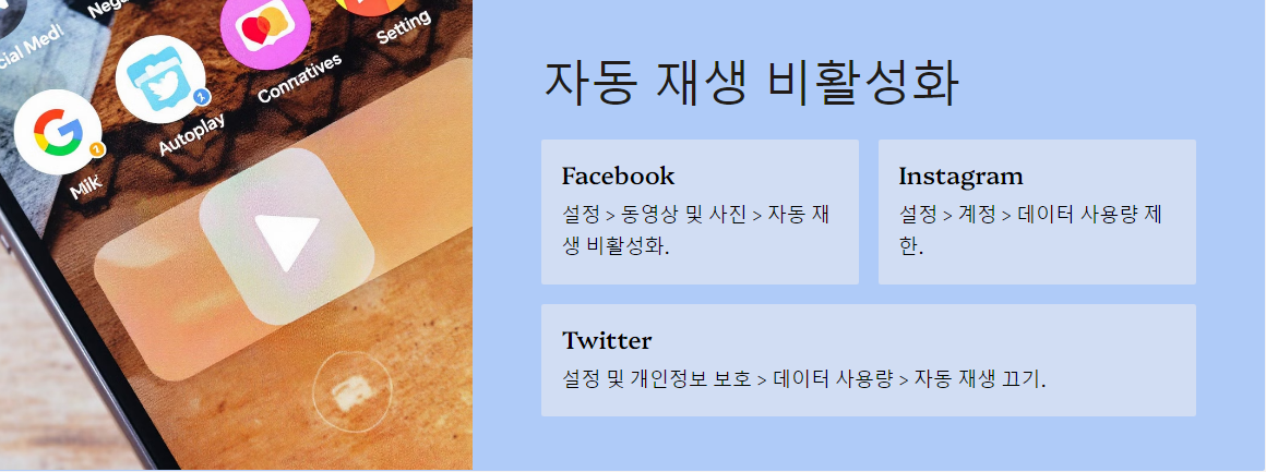 - Facebook: 설정 > 동영상 및 사진 > 자동 재생 비활성화.